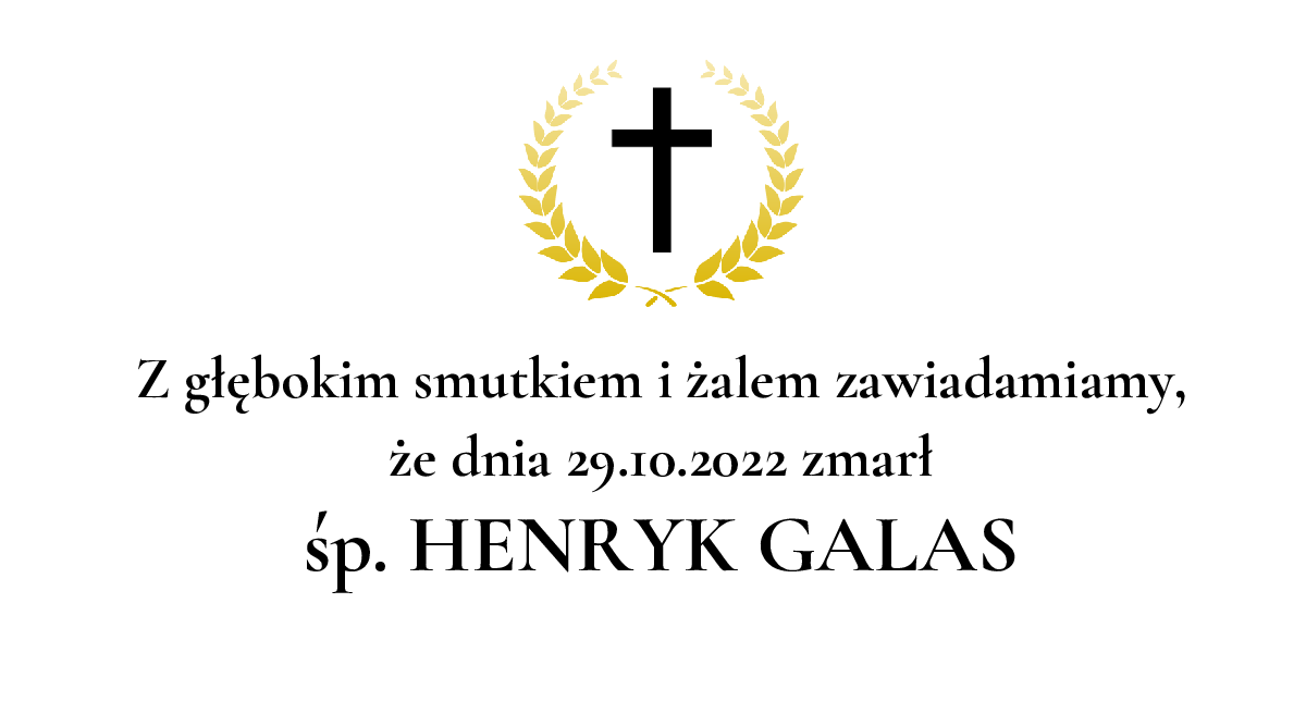 Data pogrzebu: 04.11.2022 Msza Święta: 04.11.2022 o godz. 10:00 Kościół św. Stanisława Kostki w Katowicach-Giszowc Katowice, ul. Górniczego Stanu 22 Wyprowadzenie do grobu o godz. 10:45 Cmentarz: Cmentarz parafialny w Katowicach-Giszowcu Katowice, ul. Górniczego Stanu
