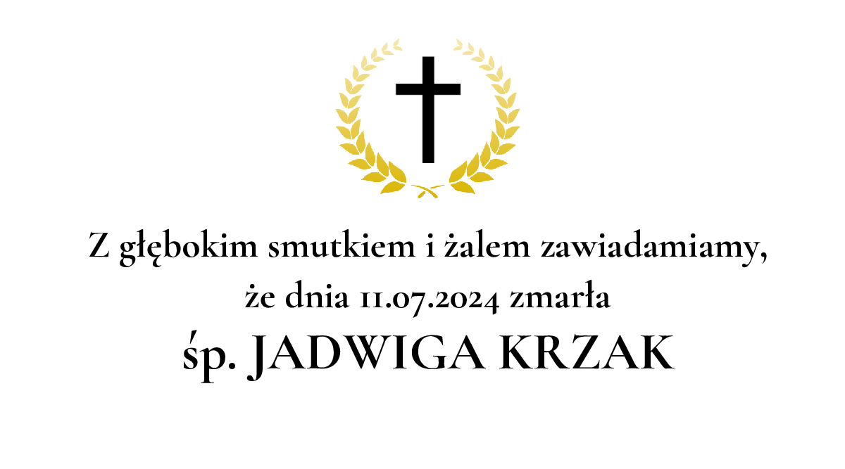 Data pogrzebu: 17.07.2024 Msza Święta: 17.07.2024 o godz. 11:00 kościół Niepokalanego Poczecia NMP (Mariacki) Katowice, ul. plac Ks. Szramka 1 Wyprowadzenie do grobu o godz. 12:00 Cmentarz: Cmentarz parafialny przy ul. Francuskiej Katowice, ul. Francuska