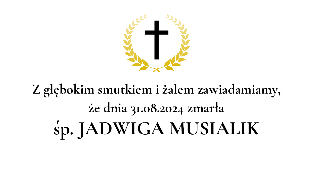 Data pogrzebu: 04.09.2024 Msza Święta: 04.09.2024 o godz. 09:30 Kościół św. Jadwigi w Katowicach-Szopienicach Katowice, ul. Plac Powstańców Śląskich 3 Wyprowadzenie do grobu o godz. 10:15 Cmentarz: cmentarz parafialny w Katowicach-Szopienicach Katowice, ul. Brynicy