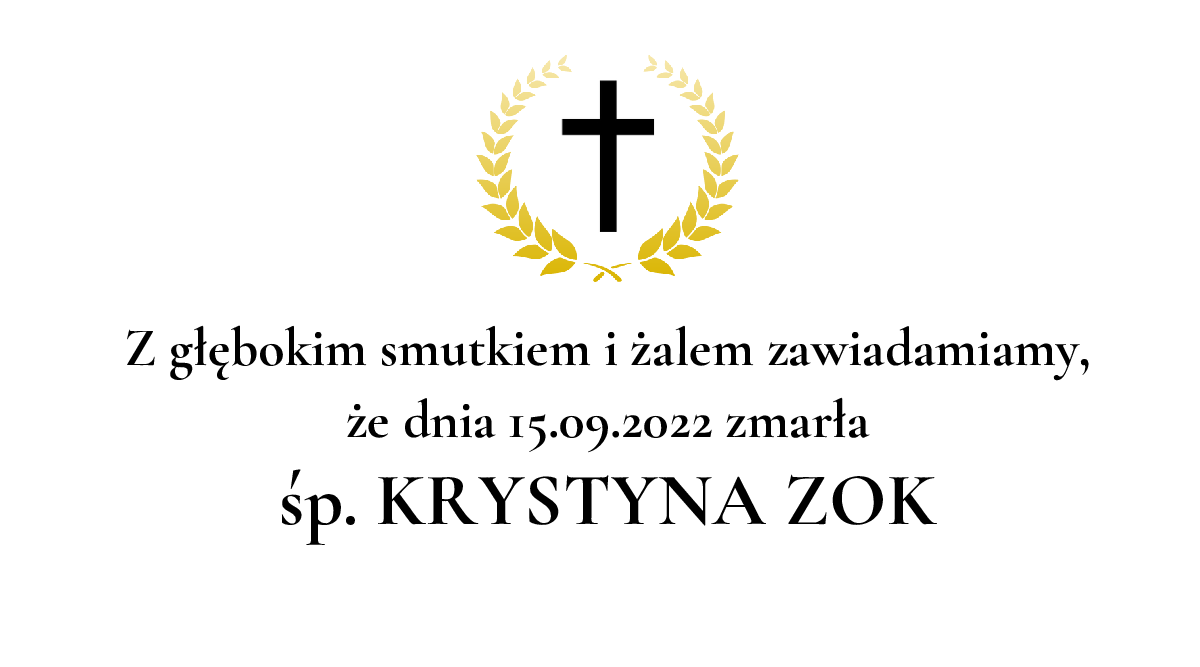 Data pogrzebu: 20.09.2022 Msza Święta: 20.09.2022 o godz. 12:00 Kościół św. Stanisława Kostki w Katowicach-Giszowc Katowice, ul. Górniczego Stanu 22 Wyprowadzenie do grobu o godz. 12:45 Cmentarz: Cmentarz parafialny w Katowicach-Giszowcu Katowice, ul. Górniczego Stanu